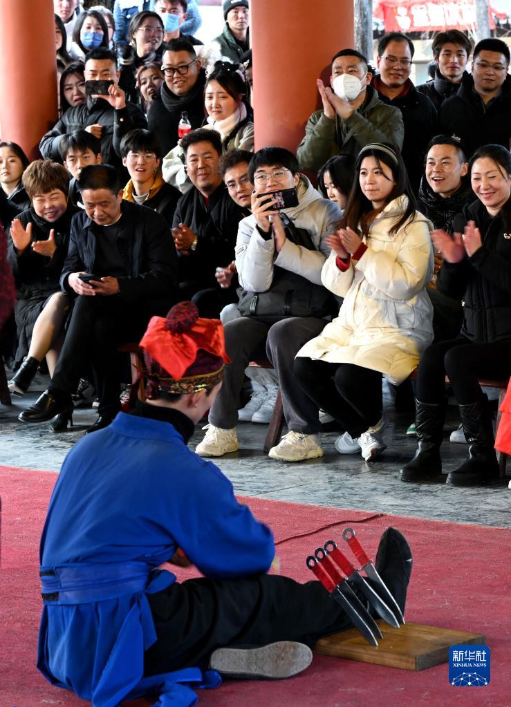 游客在開(kāi)封清明上河園景區內觀(guān)看民俗表演(2月14日攝)。