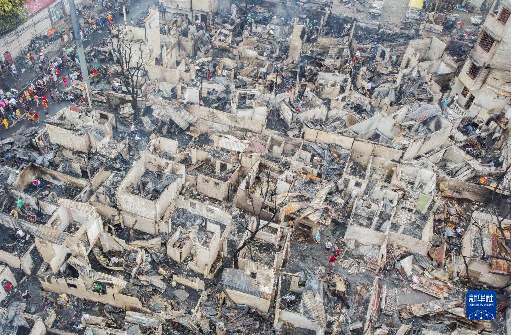 這是2月19日在菲律賓奎松拍攝的被燒毀的房屋(無(wú)人機照片)。