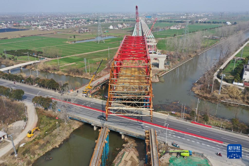 2月19日拍攝的中鐵二十局常泰長(cháng)江大橋南北公路接線(xiàn)工程跨G345特大橋鋼桁梁頂推作業(yè)現場(chǎng)(無(wú)人機照片)。