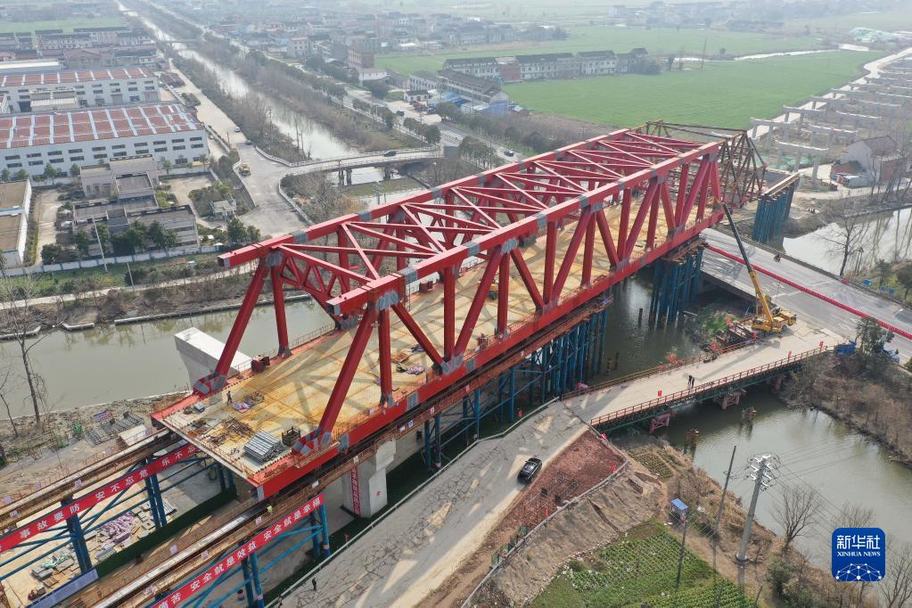 2月19日拍攝的中鐵二十局常泰長(cháng)江大橋南北公路接線(xiàn)工程跨G345特大橋鋼桁梁頂推作業(yè)現場(chǎng)(無(wú)人機照片)。