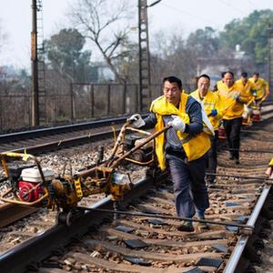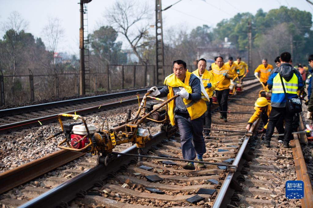 2月19日,在滬昆鐵路婁底至湘潭東區間,工人在移動(dòng)螺栓松緊機。