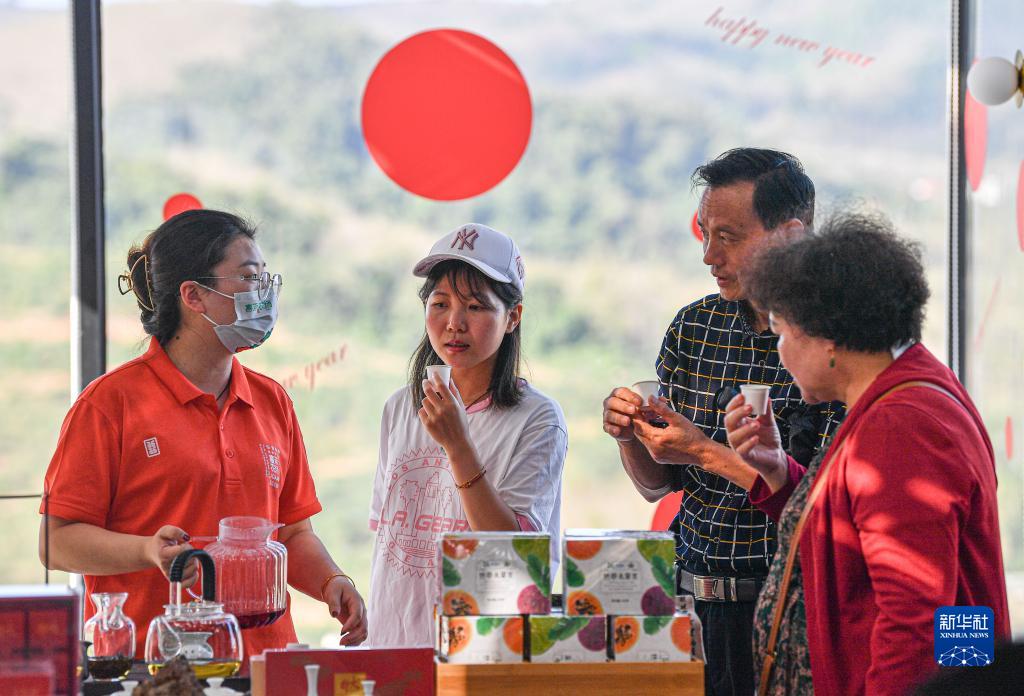 2月18日,游客在位于海南省儋州市的嘉禾共享農莊品嘗工作人員(左一)沖泡的熱帶茶品。