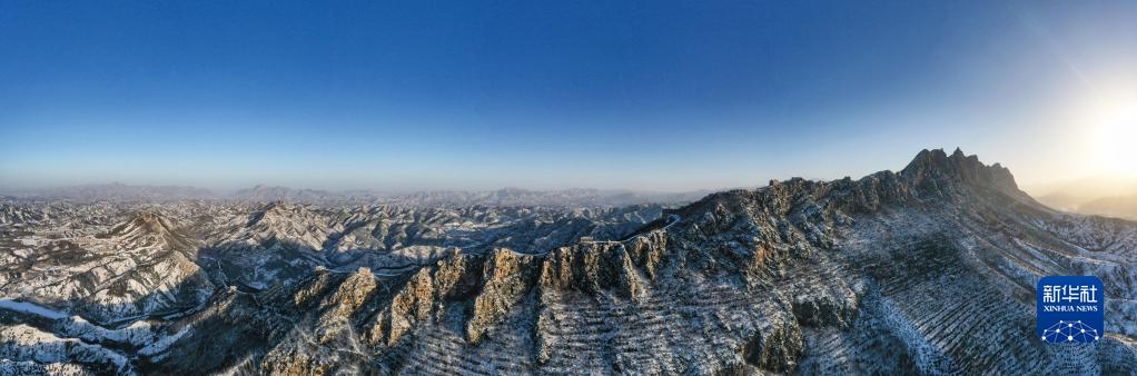 這是2月19日在晨曦中拍攝的雪后司馬臺長(cháng)城(無(wú)人機全景照片)。