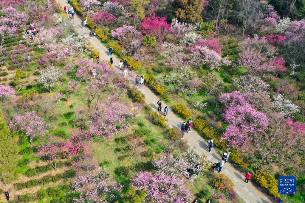 2月19日,游客在江蘇南京梅花山賞花游玩(無(wú)人機照片)。