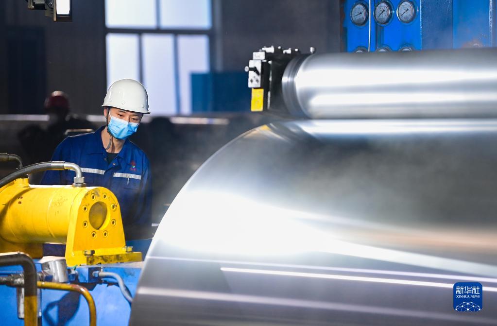 2月19日,在霍林郭勒市一家鋁業(yè)公司,工人在鋁箔生產(chǎn)線(xiàn)上巡查。