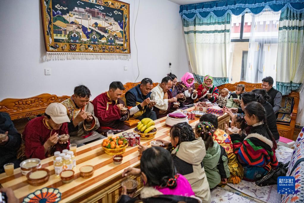 在位于森布日安置點(diǎn)的家中,石秀次仁一家正在吃“古突”(2月19日攝)。