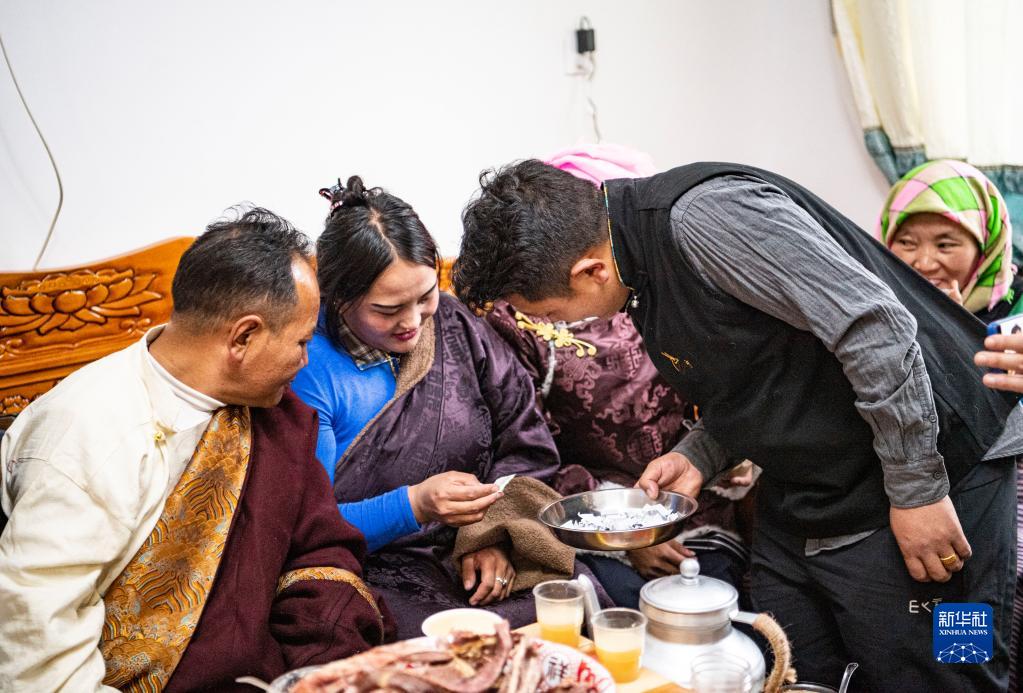 在位于森布日安置點(diǎn)的家中,石秀次仁(左一)和家人查看隨機抽取的小紙條。畫(huà)在紙條上的圖案有著(zhù)不同的寓意(2月19日攝)。