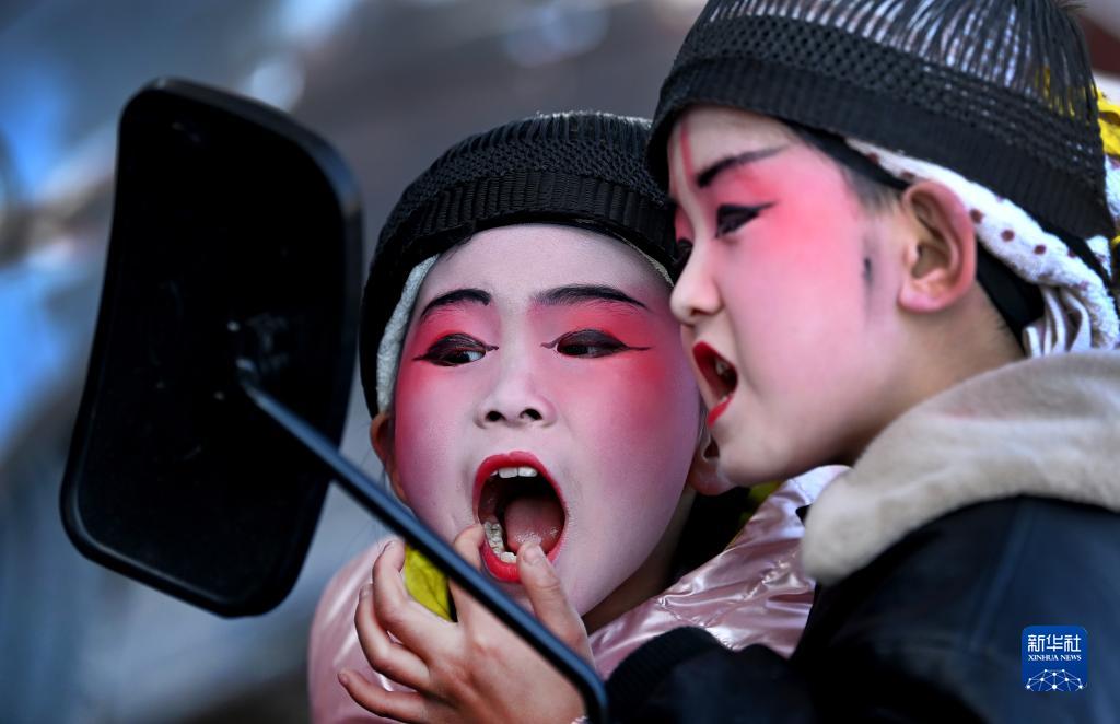2月19日,西安市臨潼區櫟陽(yáng)街道卷子村參加“背芯子”表演的兩名小朋友查看自己的化妝效果。