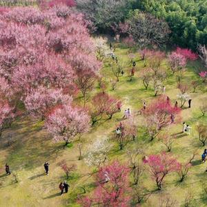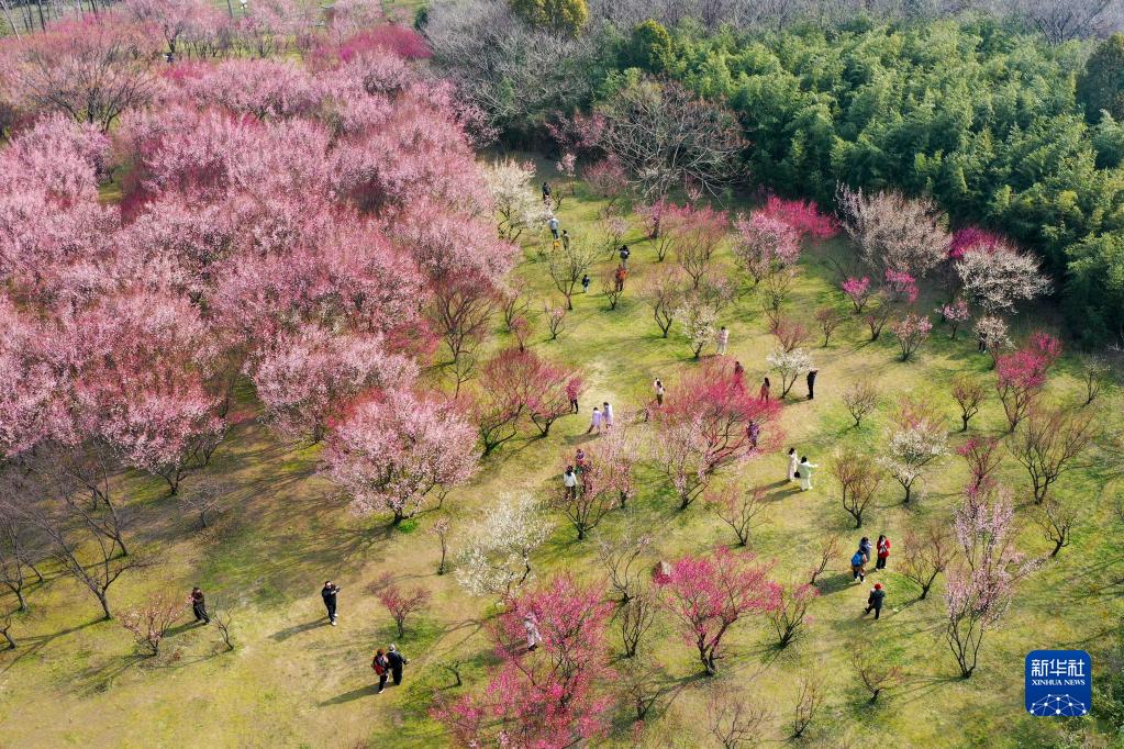 2月19日,市民在江蘇揚州蜀岡西峰踏春賞梅(無(wú)人機照片)。