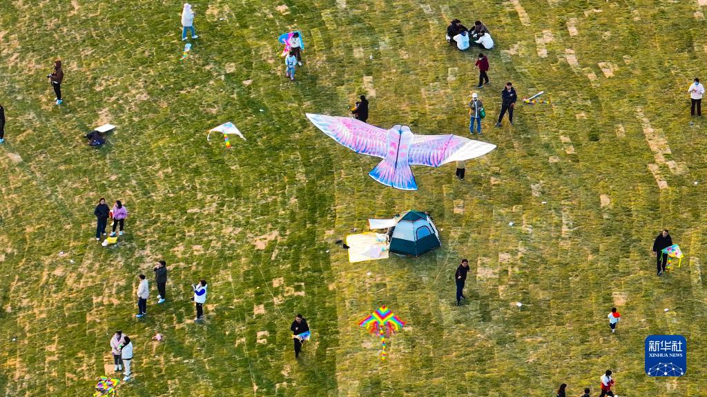 2月19日,安徽淮北市市民在中湖國家濕地公園游玩(無(wú)人機照片)。