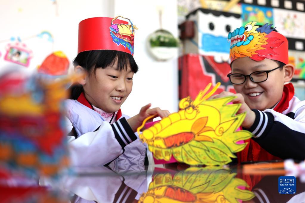 2月20日,山東省濱州市渤海中學(xué)南校區的小學(xué)生制作“龍抬頭”主題的頭飾手工作品。