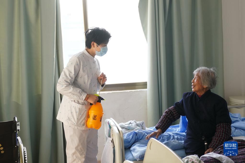 2月15日,在南通常青樂(lè )齡護理院,李楠楠在房間消毒時(shí)與老人聊天。