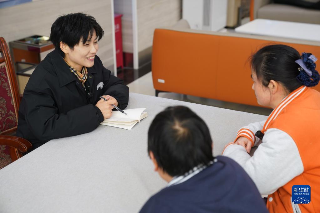 2月14日,李楠楠(左)下班后走訪(fǎng)南通市陽(yáng)光老年公寓,和護理員交流。