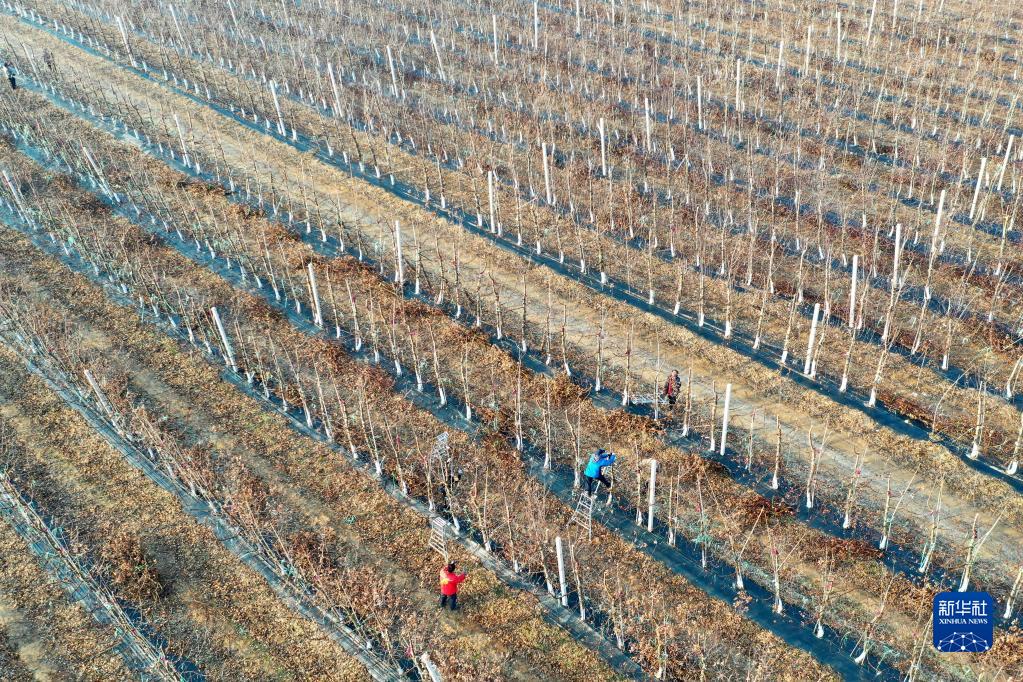 2月19日,在夏莊鎮甲夼區域鄉村振興共富黨建聯(lián)盟一處現代化蘋(píng)果產(chǎn)業(yè)基地內,村民在進(jìn)行果樹(shù)修枝、施肥作業(yè)(無(wú)人機照片)。