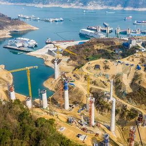 2月20日,工人在三峽庫區湖北省宜昌市秭歸縣三峽樞紐茅坪港疏港鐵路建設工地施工(無(wú)人機照片)。