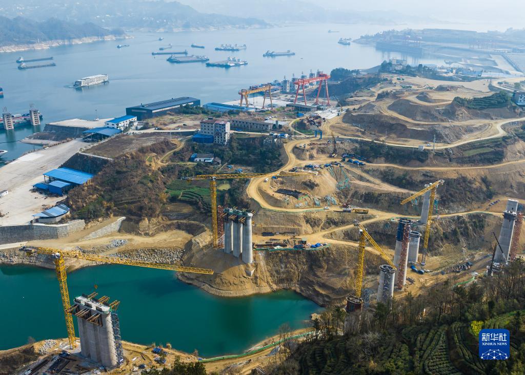 2月20日,工人在三峽庫區湖北省宜昌市秭歸縣三峽樞紐茅坪港疏港鐵路建設工地施工(無(wú)人機照片)。