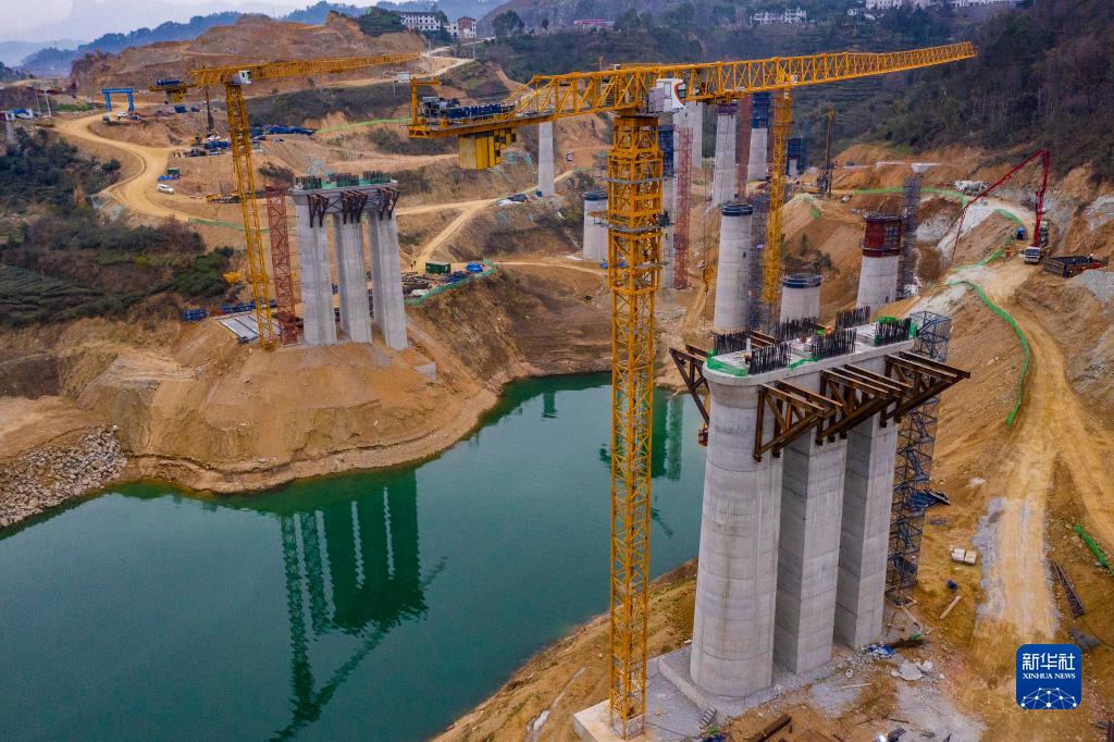 2月20日,工人在三峽庫區湖北省宜昌市秭歸縣三峽樞紐茅坪港疏港鐵路建設工地施工(無(wú)人機照片)。