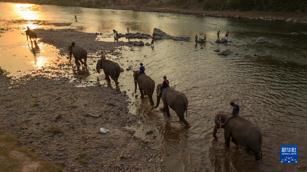 這是2月18日在老撾沙耶武里航拍的大象穿過(guò)河流。