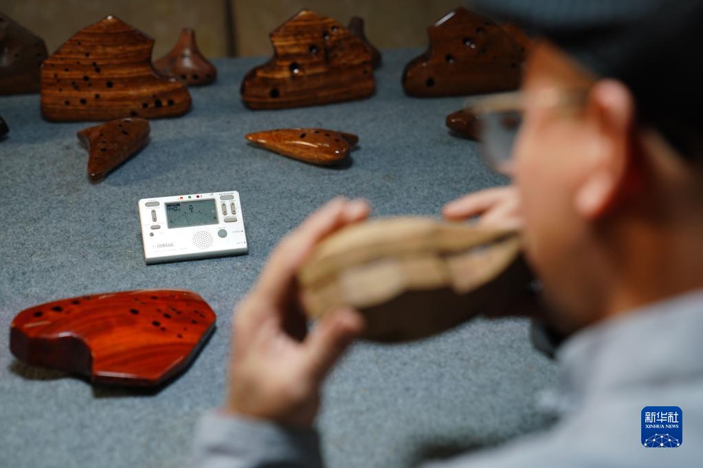 2月20日,陶笛藝人侯義敏為木質(zhì)陶笛調音。