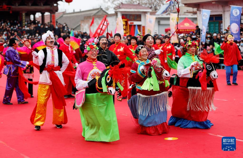 2月21日,在山西省臨汾市襄汾縣陶寺鄉陶寺村,民間社火隊在“二月二龍抬頭社火節”活動(dòng)中表演傳統民俗“跑驢”。