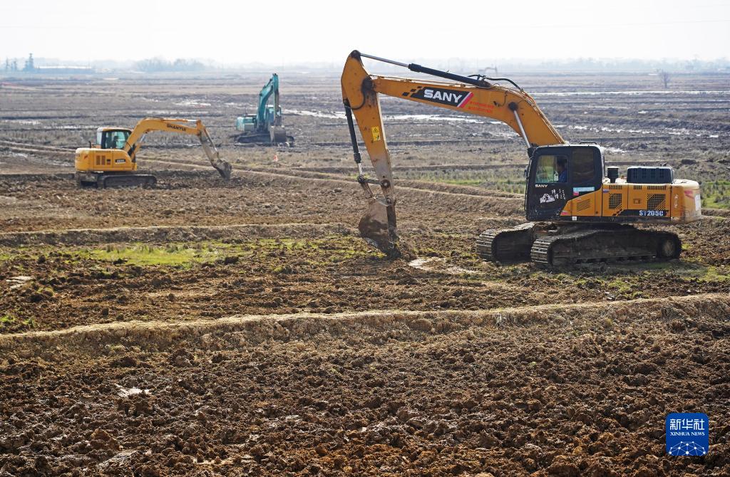 2月21日,施工人員在新建區象山鎮高標準農田建設現場(chǎng)平整田地。