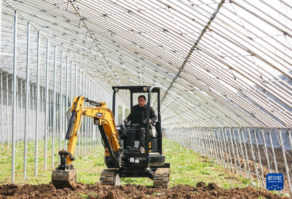 2月20日,工人駕駛機械在瑞昌市賽湖農場(chǎng)三分場(chǎng)建設智慧大棚。