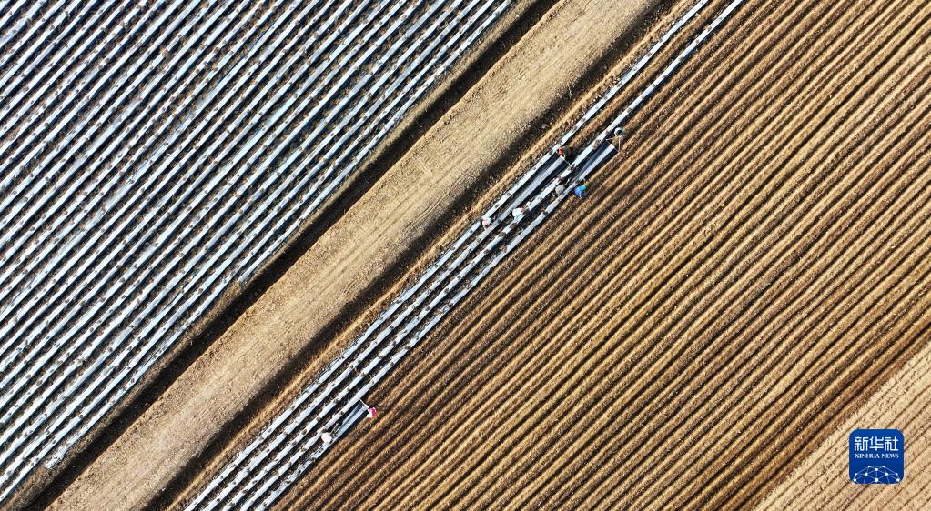 2月21日,在山東省臨沂市郯城縣郯城街道民樂(lè )種植農民專(zhuān)業(yè)合作社種植基地,工人為種植的土豆覆膜(無(wú)人機照片)。