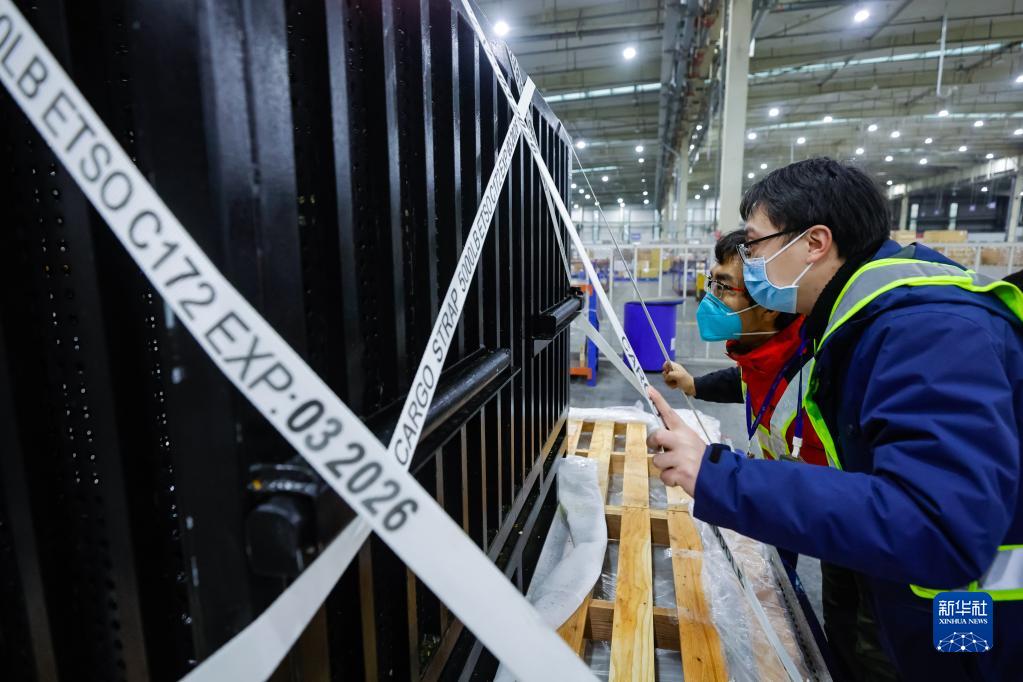 2月21日,大熊貓“香香”抵達成都雙流國際機場(chǎng)海關(guān)查驗區,工作人員和中國大熊貓保護研究中心的獸醫(右二)對其進(jìn)行查驗。