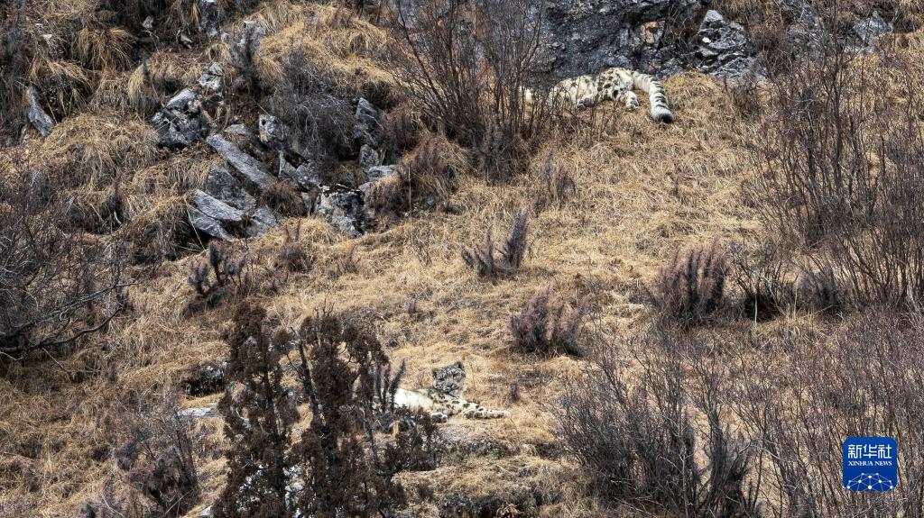 2月21日,在青海省玉樹(shù)藏族自治州雜多縣昂賽鄉境內的昂賽大峽谷內,兩只雪豹正在休息。