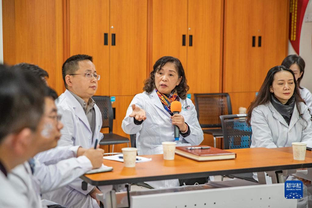 2月16日,在重慶醫科大學(xué)附屬兒童醫院兩江院區,李秋(中)與腎臟內科的醫護人員交流時(shí)發(fā)言。