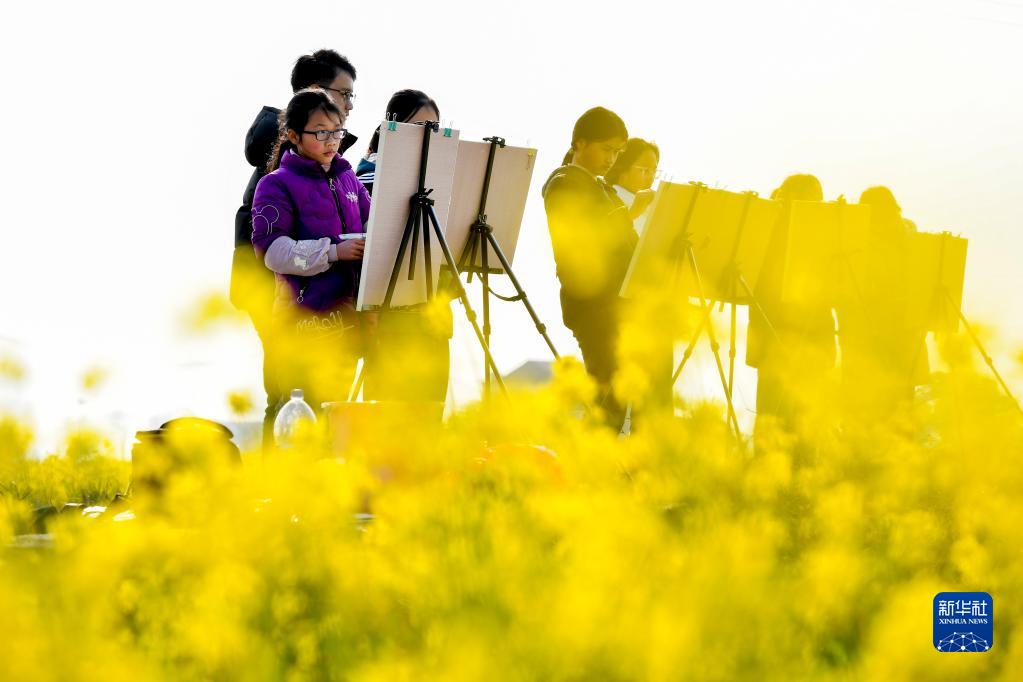 2月21日,一群學(xué)生在江西省樟樹(shù)市永泰鎮官湖村油菜花海中寫(xiě)生。
