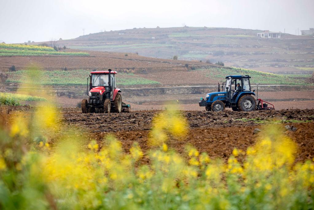 2月22日,在貴州省黔西市林泉鎮清浦村,農民駕駛拖拉機翻耕土地。