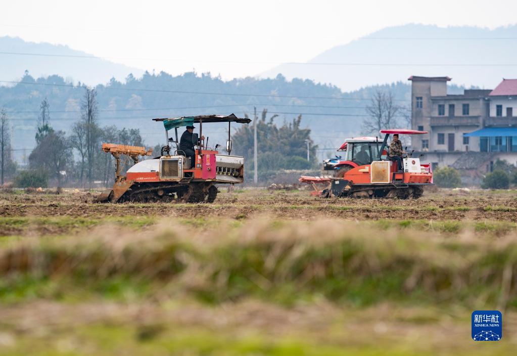 2月22日,在江西省新余市渝水區南安鄉荊蘭村,農民駕駛拖拉機、旋耕機翻耕土地。