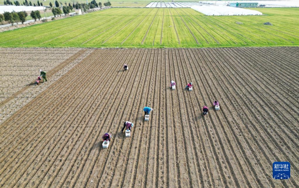 2月21日,山東省滕州市姜屯鎮農民在種植土豆(無(wú)人機照片)。