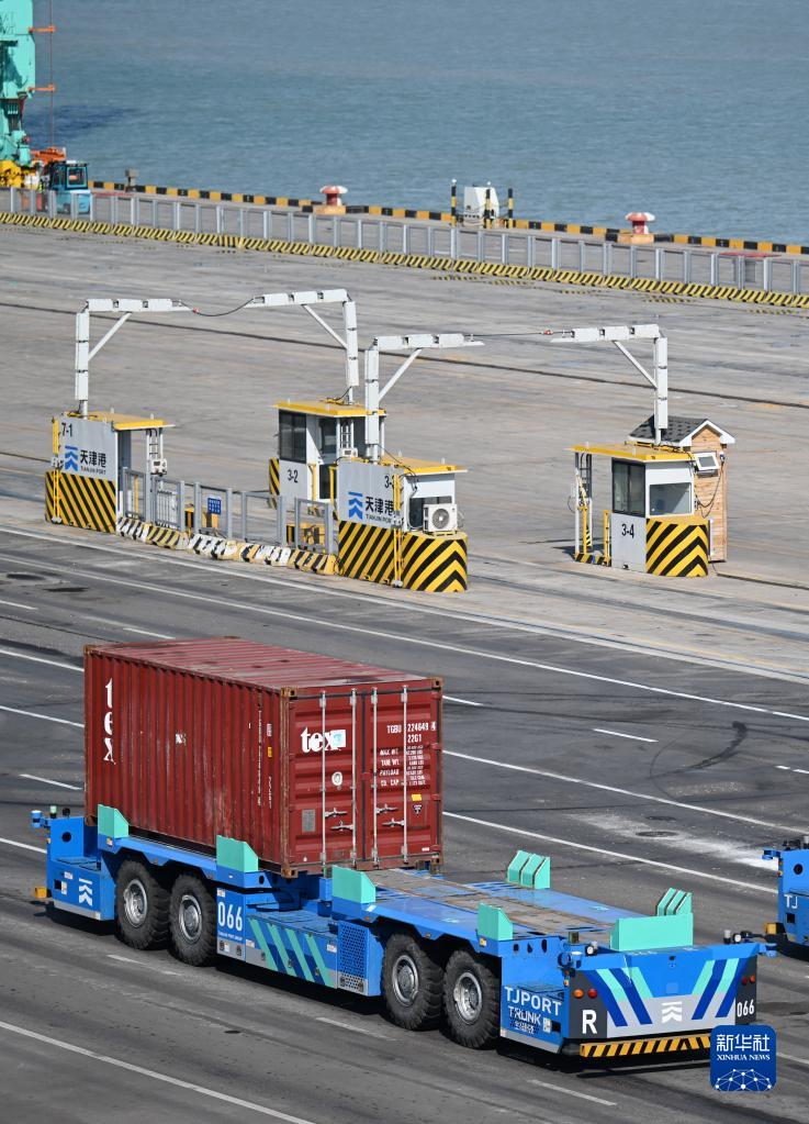 智能水平運輸機器人在天津港全物聯(lián)網(wǎng)集裝箱碼頭作業(yè)(2月21日攝)。
