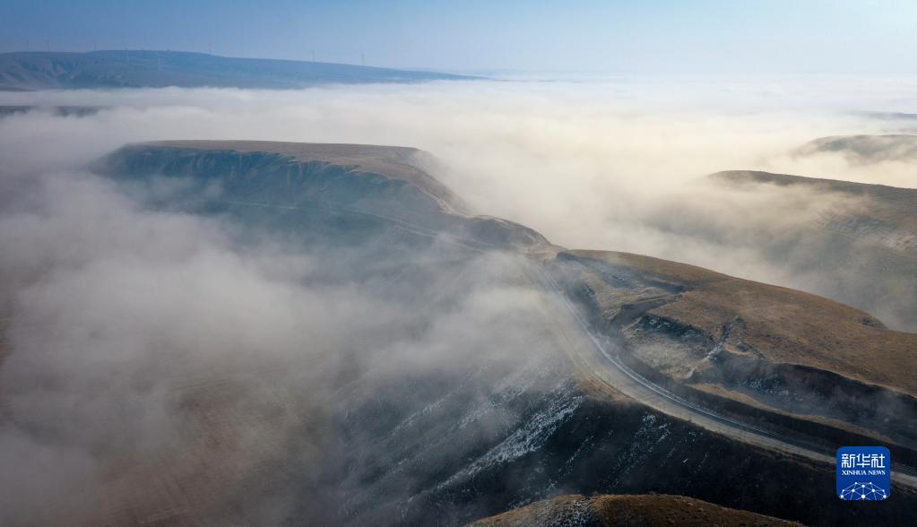 當日,寧夏吳忠市同心縣的山谷間出現云海景觀(guān),農田、旱塬、公路在霧中若隱若現,景色壯美。