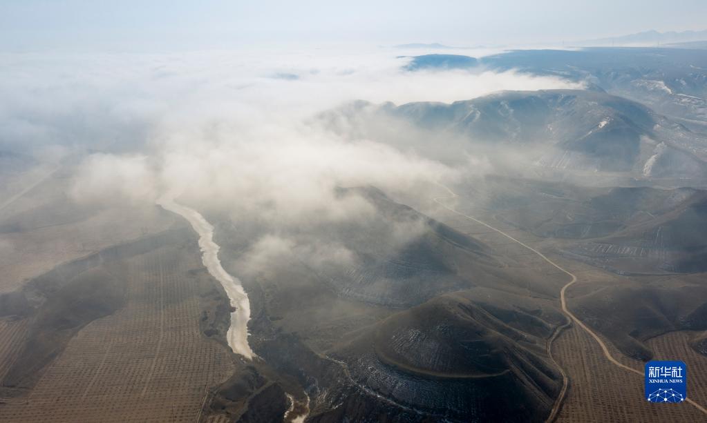 當日,寧夏吳忠市同心縣的山谷間出現云海景觀(guān),農田、旱塬、公路在霧中若隱若現,景色壯美。