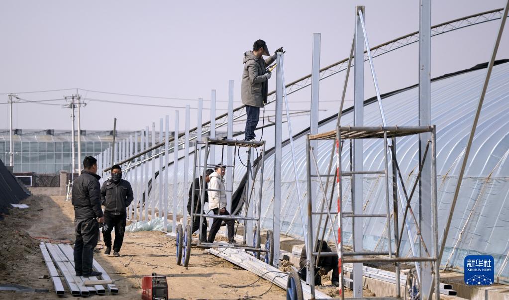 2月22日,工人在北京市大興區龐各莊鎮一家合作社建設現代化農業(yè)大棚。