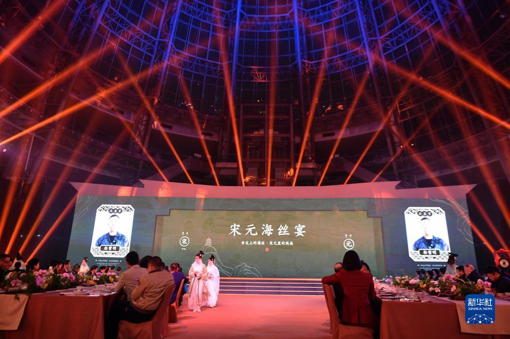 當日,福建泉州石獅市舉辦“閩菜地標美食城市”授牌暨“宋元海絲宴”推介儀式?!八卧=z宴”以南宋福建泉州石獅籍美食家林洪著(zhù)作《山家清供》為還原藍本,兼收閩南名菜,集山珍、海味于一席,將菜品、宴席與宋元器皿、場(chǎng)景、樂(lè )曲、詩(shī)詞等融合,展現宋元時(shí)期世界海洋商貿中心獨特的美食文化。新華社記者 魏培全 攝