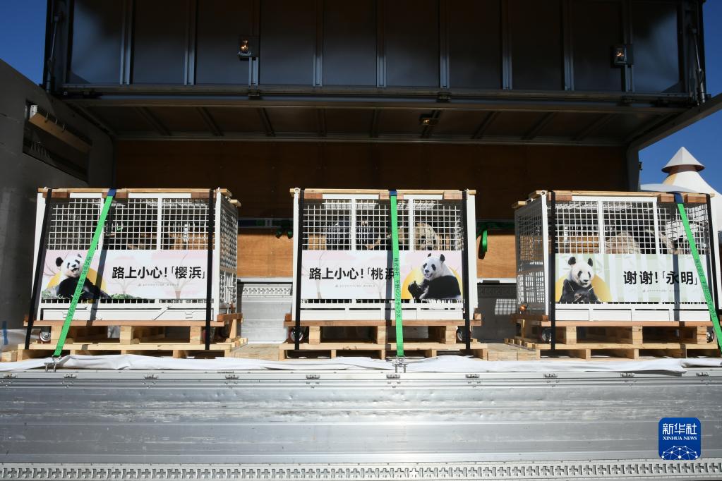 2月22日,在日本和歌山縣白浜町的“冒險世界”樂(lè )園,三只大熊貓已經(jīng)裝車(chē)準備出發(fā)。