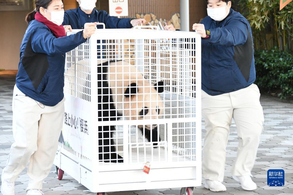 2月22日,在日本和歌山縣白浜町的“冒險世界”樂(lè )園,工作人員運送大熊貓“櫻浜”。