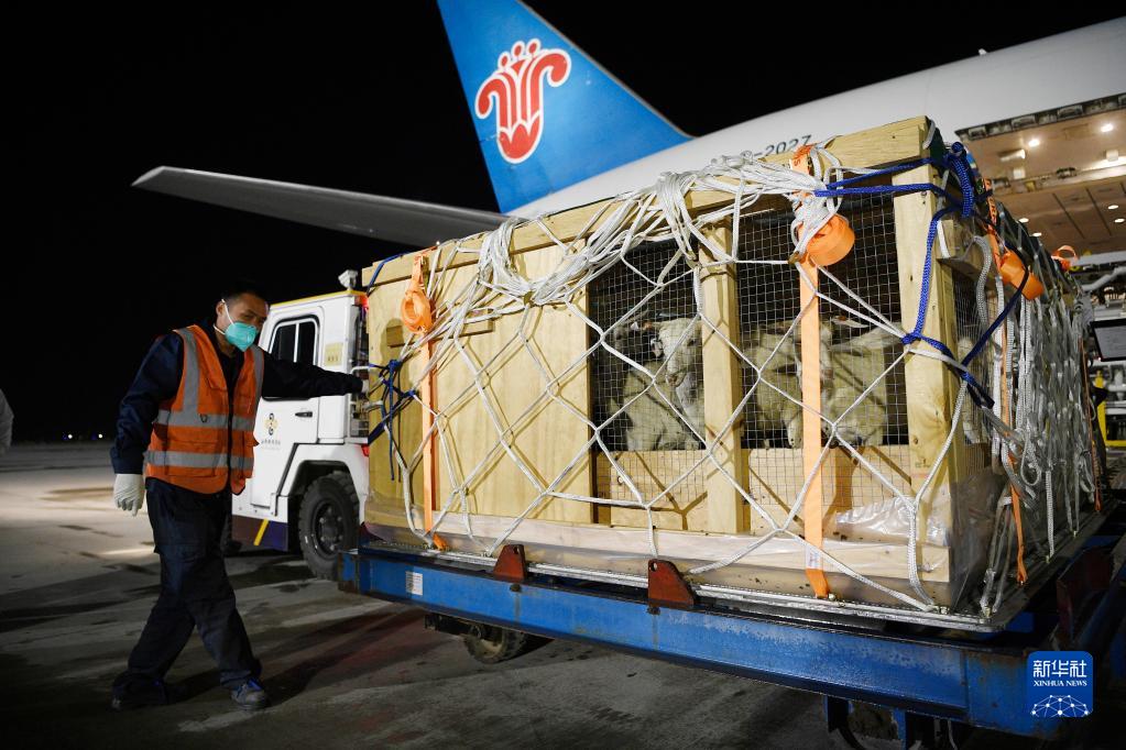 銀川河東國際機場(chǎng)工作人員對種羊進(jìn)行轉運(2月22日攝)。