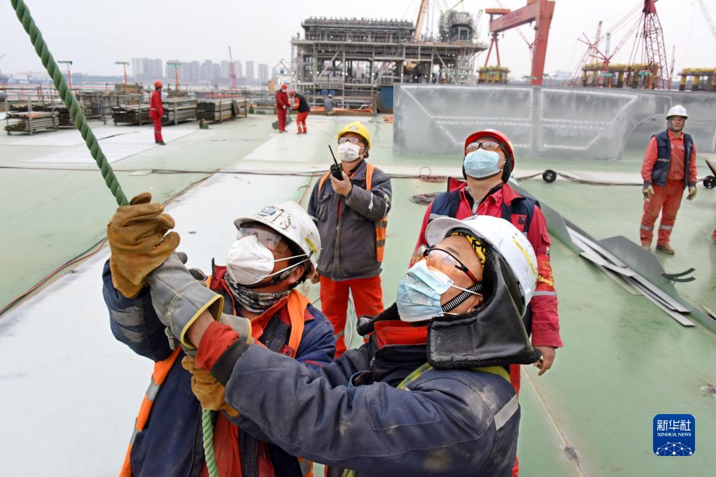 2月22日,工人在渤中19-6凝析氣田一期CEPA(中心處理平臺)組塊建造現場(chǎng)進(jìn)行吊裝作業(yè)。