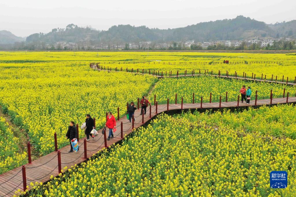 2月20日,游客在貴州省平塘縣平舟鎮京舟村油菜花田游玩(無(wú)人機照片)。