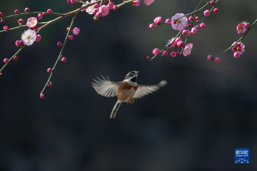 2月18日,在江蘇省無(wú)錫市管社山莊,一只小鳥(niǎo)在梅花叢中飛舞。