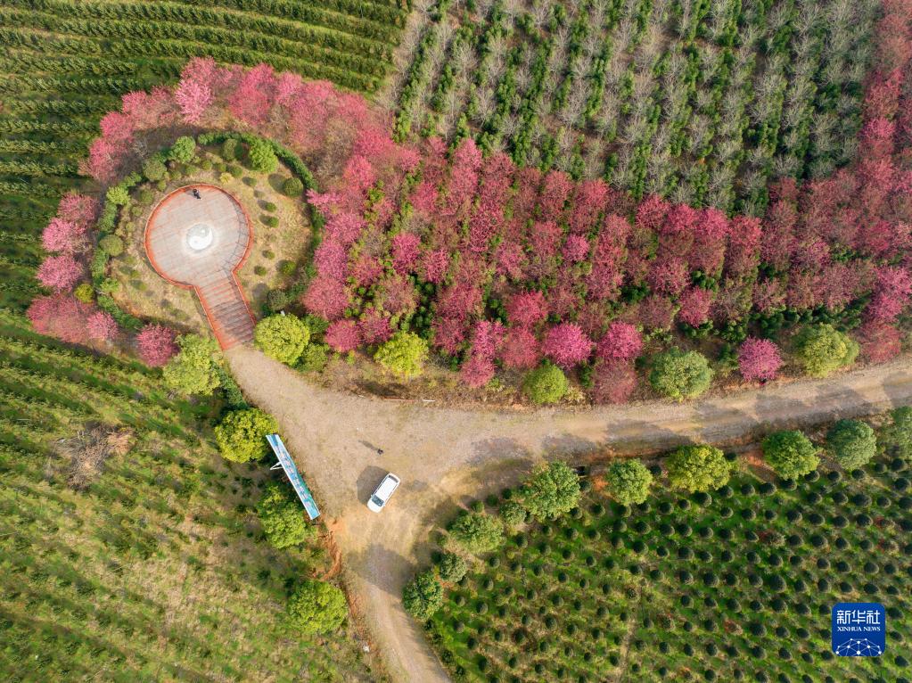 2月18日在江西省撫州市金溪縣新塔園藝觀(guān)光園中拍攝的盛開(kāi)的梅花(無(wú)人機照片)。