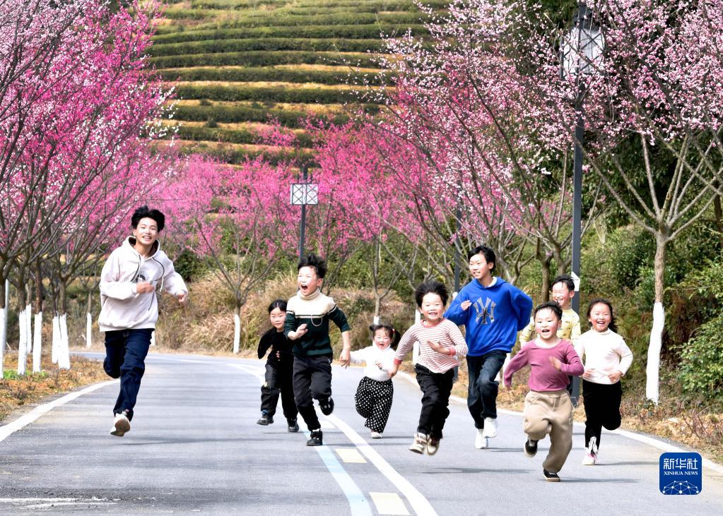 2月18日,在江西省樂(lè )平市洪巖鎮一處茶葉生產(chǎn)基地,孩子們在梅花大道游玩。