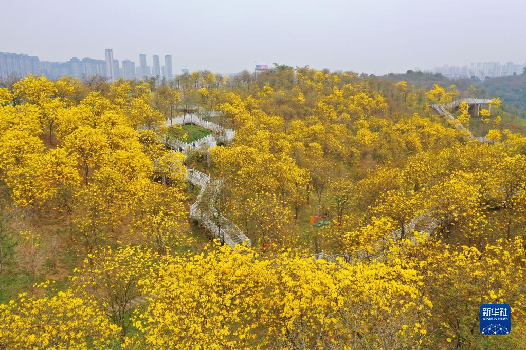 2月23日,游人在廣西南寧市青秀山風(fēng)景區的風(fēng)鈴谷觀(guān)賞綻放的黃花風(fēng)鈴木花(無(wú)人機照片)。