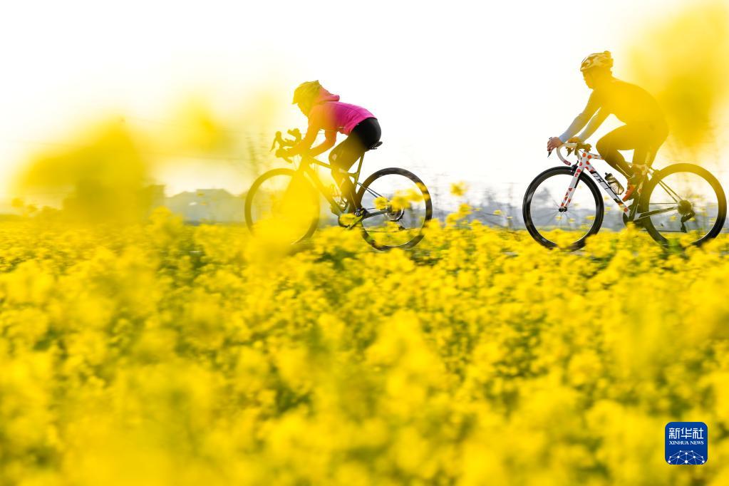2月21日,騎行愛(ài)好者在江西省樟樹(shù)市永泰鎮官湖村油菜花海中騎行。