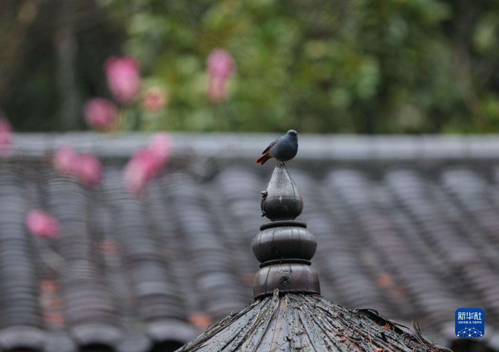 2月23日,在張家界市武陵源區黃龍洞景區,一只小鳥(niǎo)在屋頂上停留。